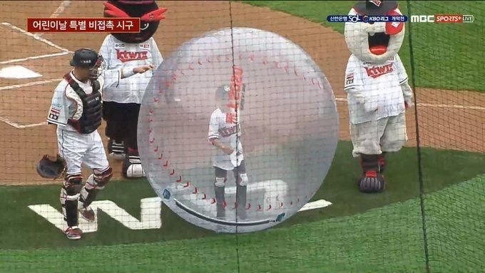 코로나19 여파로 인해 예정보다 늦게 개막했지만, 이 와중에도 ‘안전’과 ‘방역’을 강조해 이색 시구를 선보였다.