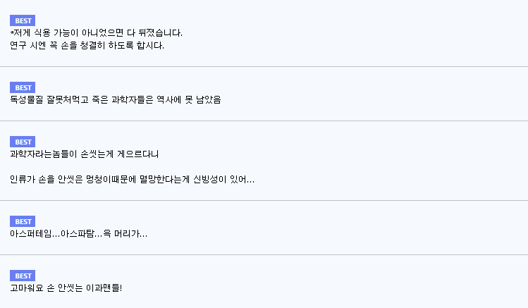 이를 본 온라인 커뮤니티 네티즌들은 “저게 식용 가능이 아니었으면 모두 살지 못했겠네요. 연구할 때는 손을 꼭 청결히 하도록 합시다.”라는 반응을 보였다.