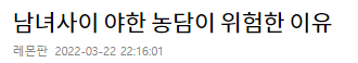 남녀사이 야한 농담이 위험한 이유 남녀사이 야한 농담이 위험한 이유 ADVERTISEMENT ADVERTISEMENT ADVERTISEMENT ADVERTISEMENT ADVERTISEMENT ADVERTISEMENT [저작권자 NEWSNACK/ 무단복사, 무단전재 및 재배포 금지 (위반 시 법적조치)]