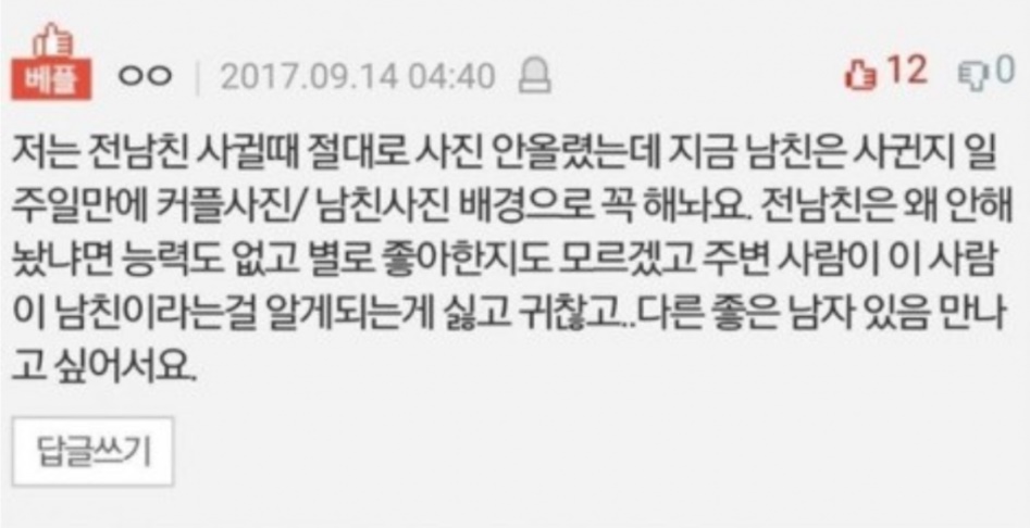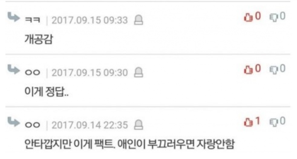 그리고 해당 댓글에는 수 많은 여성들이 공감하며 “개공감” “이게 정답,,” “안타깝지만 이게 팩트, 애인이 부끄러우면 자랑안함” 라며 댓글이 달렸다.