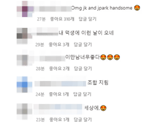 활짝 웃고 있는 박재범의 어깨에 팔을 올리고 유쾌한 표정을 짓고 있는 정국의 모습이 이목을 집중시켰다.