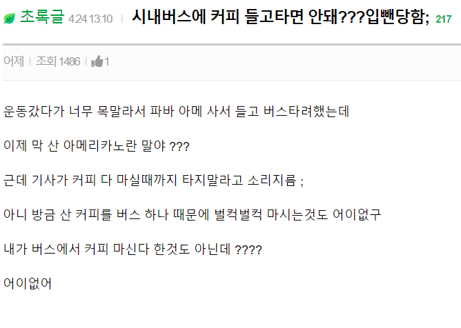 “방금 산 커피를 버스 하나 때문에 모두 먹어야 한다는 것도 어이가 없고 내가 버스에서 커피 마신다고 한 것도 아닌데 완전 어이없다.”라며 말을 덧붙였다.
