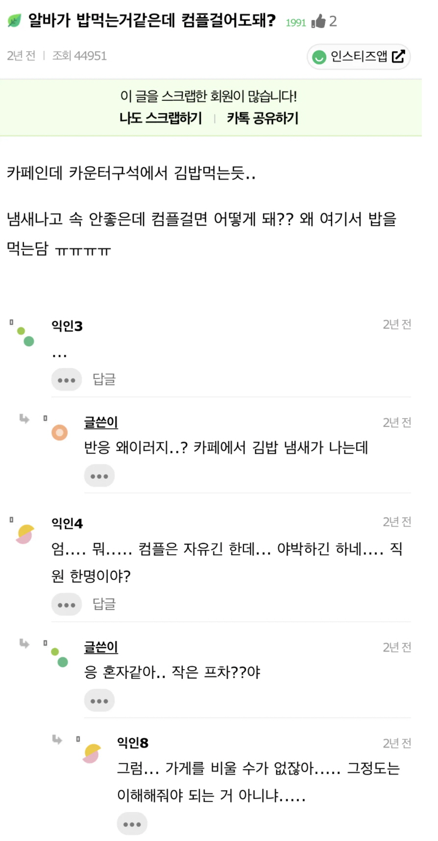 글쓴이는 “카페에서 아르바이트생이 김밥을 먹고 있는데 컴플레인을 걸 수 있을까요?”라며 이야기를 시작했다.