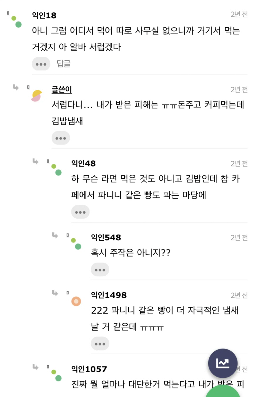 이를 본 온라인 커뮤니티 네티즌들은 “열심히 일하다가 시간도 없고, 장소도 협소하면 카페에서 김밥 정도는 먹을 수도 있는 거죠 글쓴이분이 너무 예민하시네요…”라는 반응을 보였다.