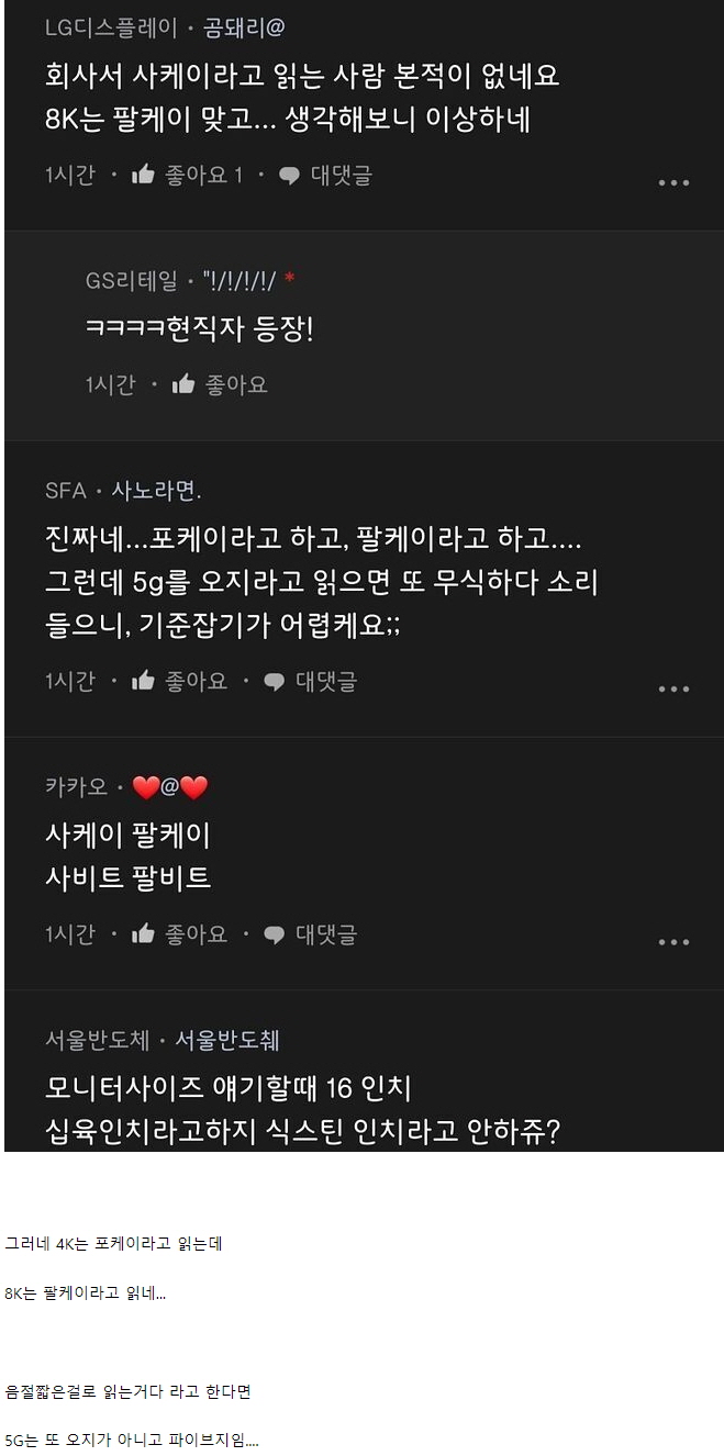 이를 본 온라인 커뮤니티 네티즌들은 “그러고 보니까 4K는 포케이로 발음하지만 8K는 팔 케이라고 발음하네요. 정말 신기해요.”, “5G 같은 경우도 오지라고 발음하지 않고, 파이브지라고 발음하지 않나요? 이것도 사람마다 다른 것 같네요?”라는 반응을 보였다.