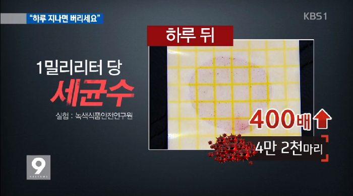 마신지 하루가 지난 물에서는 세균이 4만 마리로 늘어나는데, 이는 기준치에 4백 배를 넘은 수치이다.