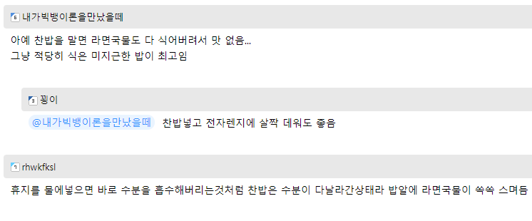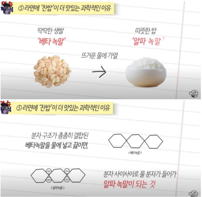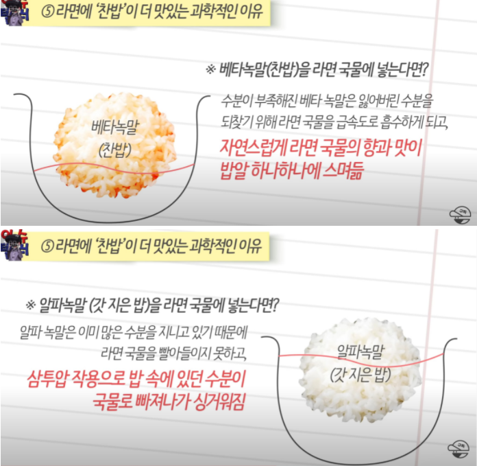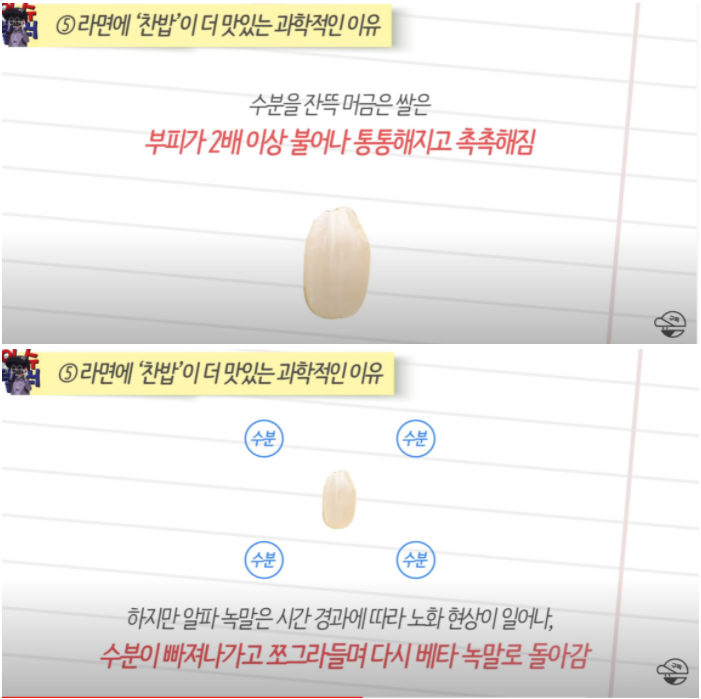 유튜버 이슈 텔러는 “베타 녹말을 가진 찬밥을 라면 국물에 넣으면 밥이 라면 국물을 빠르게 흡수하고 자연스럽게 라면 국물의 향과 맛이 밥알 하나하나에 스며들어서 더 맛이 좋다.”라고 설명했다.