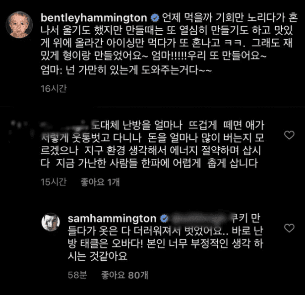 해당 덧글을 본 방송인 샘 해밍턴은 “쿠키 만들다가 옷은 더러워져서 벗은 겁니다.”, “덧글 작성하신 분이 너무 부정적인 생각을 하시는 것 같아요.”라고 답했다.