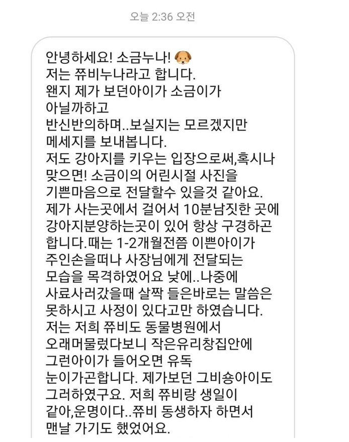 이어 “그러던 중 내가 소금이를 모를 때부터 관심 가지고 지켜봐 주던 분에게 다이렉트 메시지가 와 있더라”라며 “앞으로 내가 전 주인과 못 쌓은 여러 가지 사랑을 가르쳐주겠다. 감사하다”고 덧붙였다.