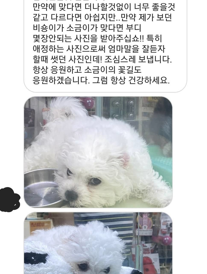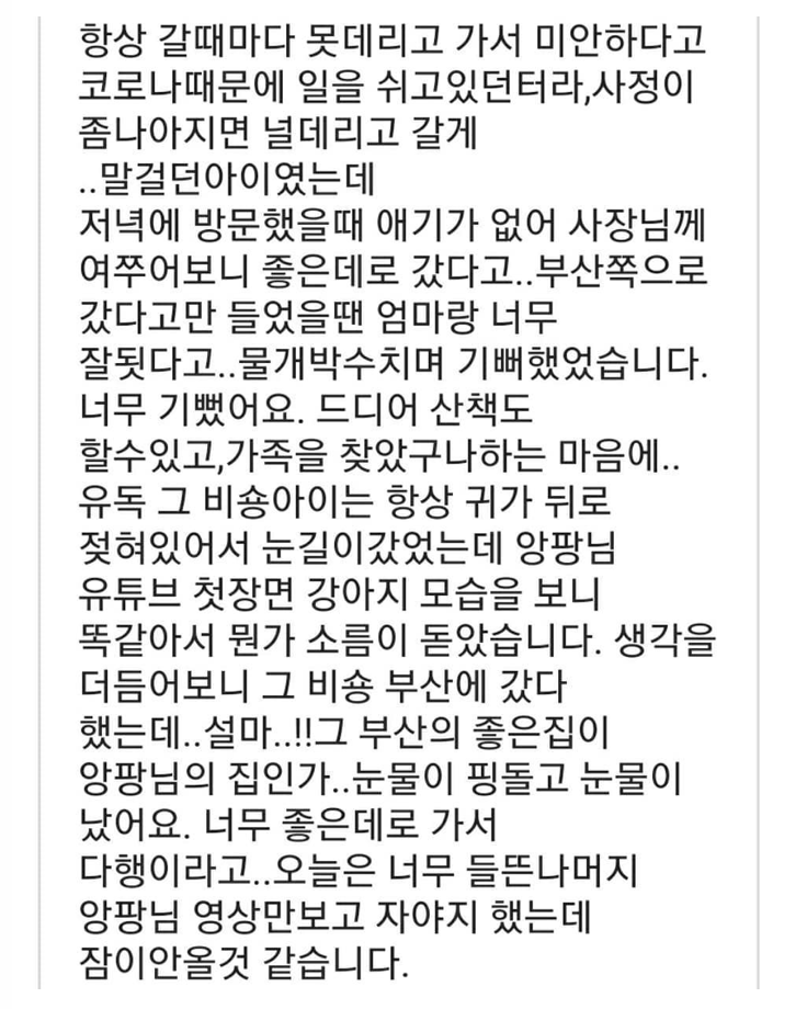 이어 “그러다 비숑이가 부산에 입양돼 갔다고 들었다. 근데 소금이 영상을 보니 비숑이와 똑같아 소름이 돋았다. 비숑이가 갔다던 부산 좋은 집이 양팡님 집인가 해서 눈물이 나더라. 너무 좋은 데로 가서 다행이다”라고 덧붙였다.