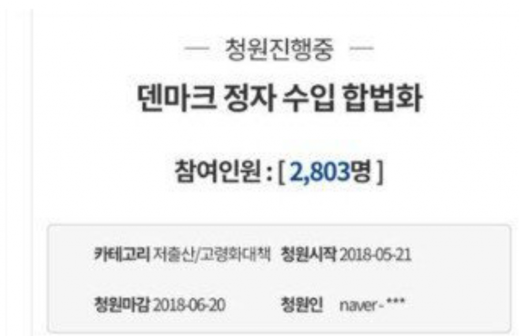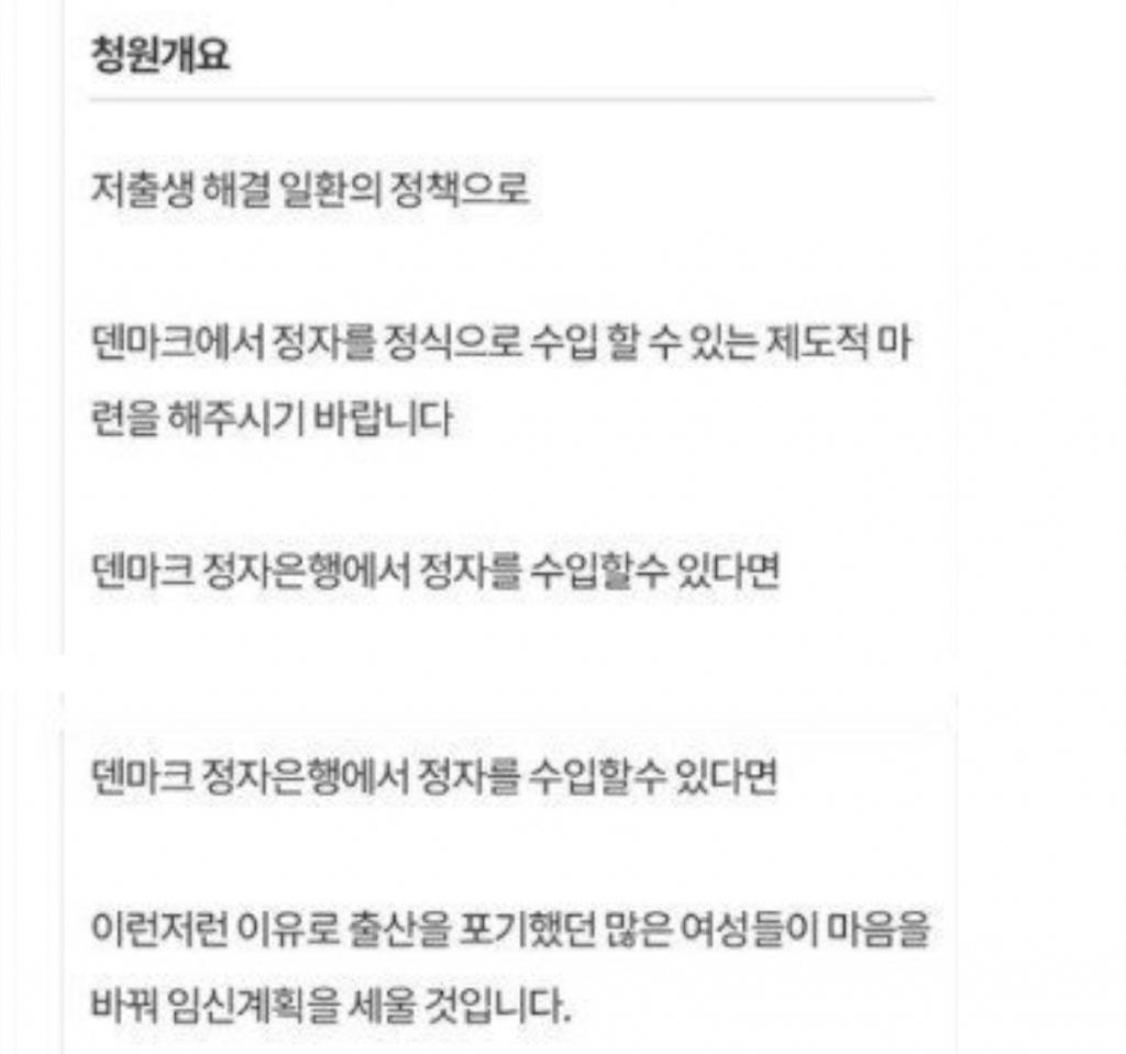 이것 저것 많은 청원이 올라온 와중에 덴마크 정자 수입을 요구하는 청원까지 올라왔다.