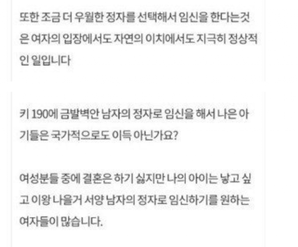 그들의 주장은 “저출생 해결 일환의 정책으로 덴마크에서 정자를 정식으로 수입할 수 있는 제도적 마련을 해주시기 바랍니다”라며 “키 190에 금발벽안 남자의 정자로 임신을 해서 나온 아기들은 국가적으로도 이득이 아니냐. 결혼은 하기 싫지만 아이는 낳고 싶고 이왕 나을거 서양 남자의 정자로 임신하기를 원하는 여자들이 많다”는 것이 그들 주장의 주요 근거다.