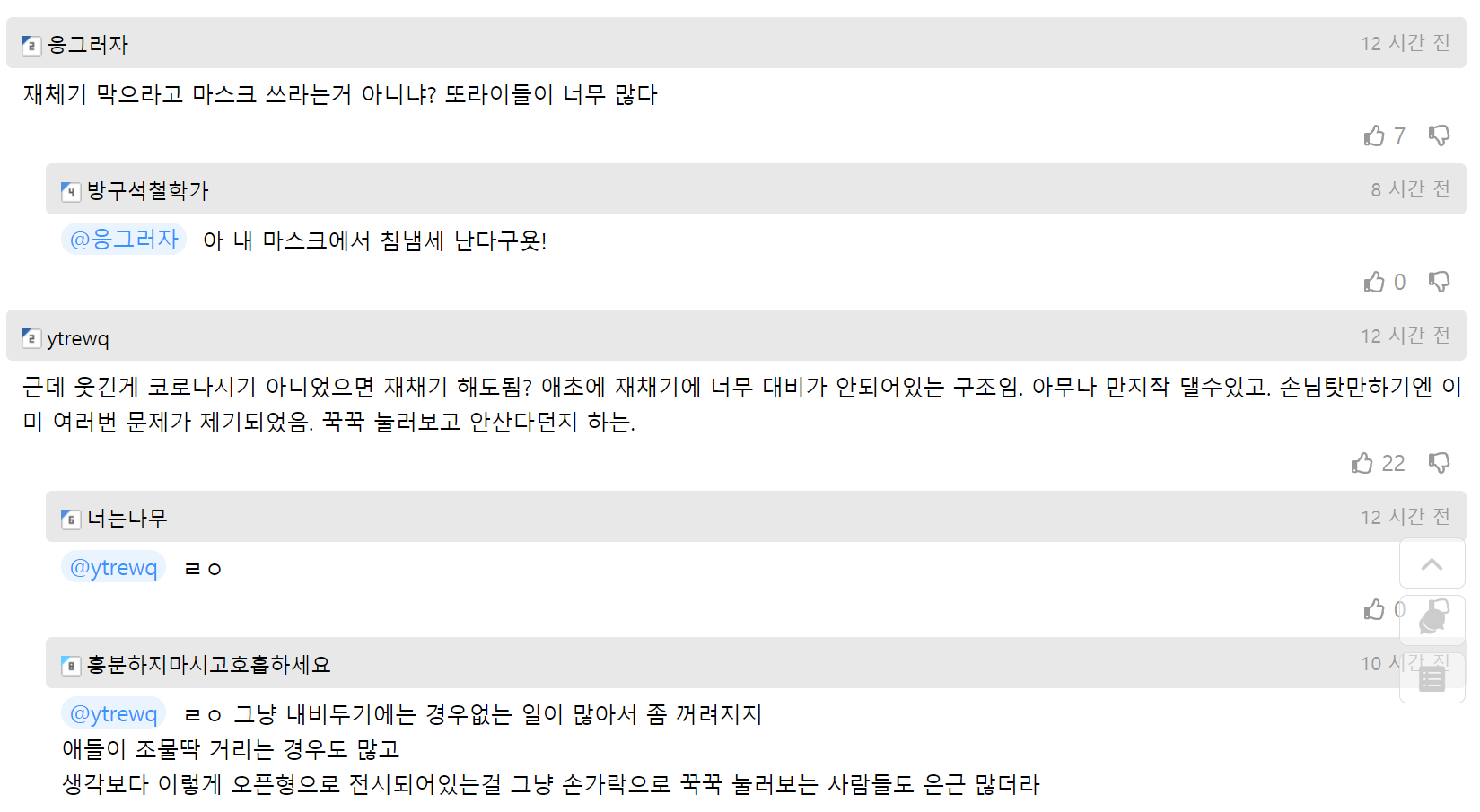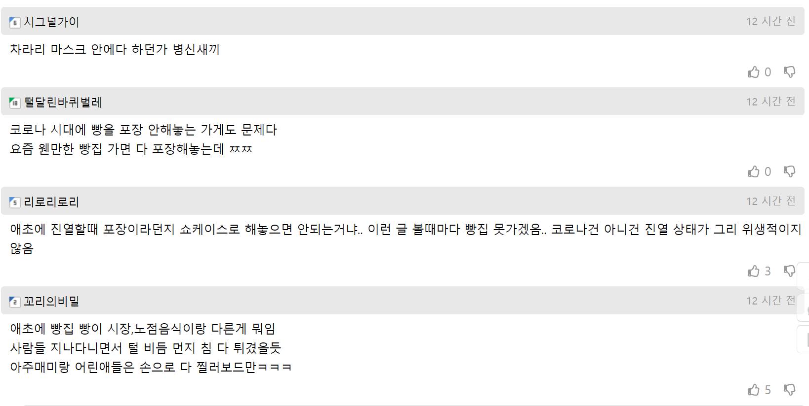 이를 본 온라인 커뮤니티 네티즌들은 “재채기를 막으려고 마스크를 착용한 것인데 마스크를 내리고 재채기를 하면 어쩌잔 거죠?”, “요즘 빵집도 빵을 오픈해놓는 것이 이해가 안 갑니다. 너무 불청결하지 않나요?”라는 반응을 보였다.