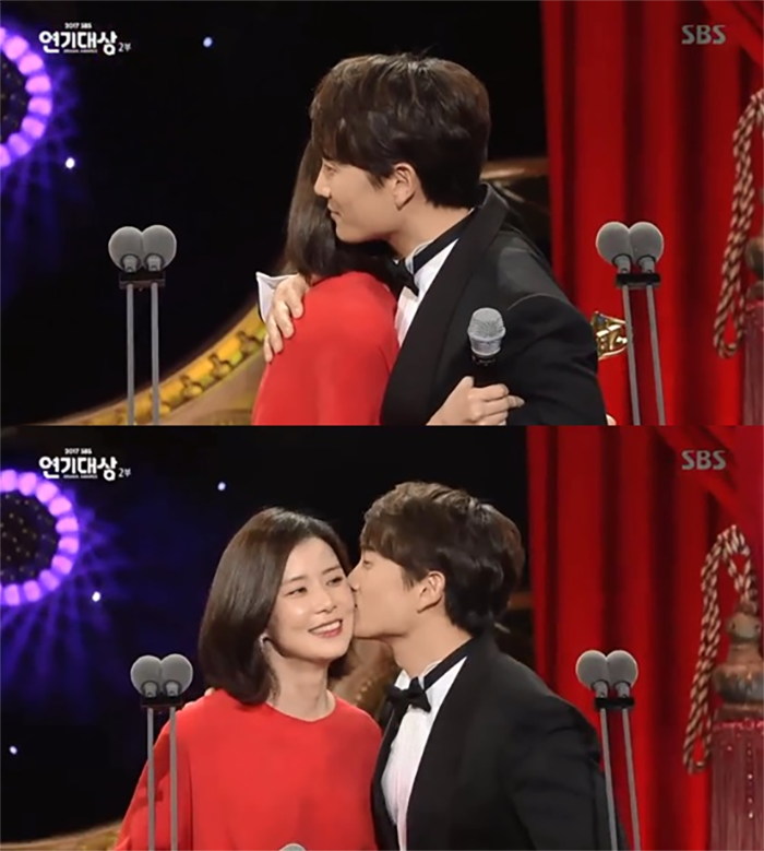 ‘킬미, 힐미’ 이후 역대 두번째 대상을 수상하며 2018년을 산뜻하게 시작한 배우 지성이, 아내 이보영에게 ‘볼 뽀뽀 세레모니’를 해 화제다.