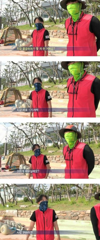 ‘지금 팔굽혀펴기 몇 개 한 거예요?’라는 제작진의 질문에 여자 요원은 ‘지금 서로 170개씩 (했다)’고 답하며 ‘200개 채우실래요? 사람 구하려면’이라고 답했다.