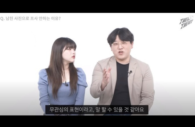 과거 유튜브 ‘스물스물’은 ‘여자가 남자친구 사진으로 프사 안 하는 이유’라는 영상을 올렸는데 해당 영상 출연자들은 각자 생각을 말하기 시작했다.