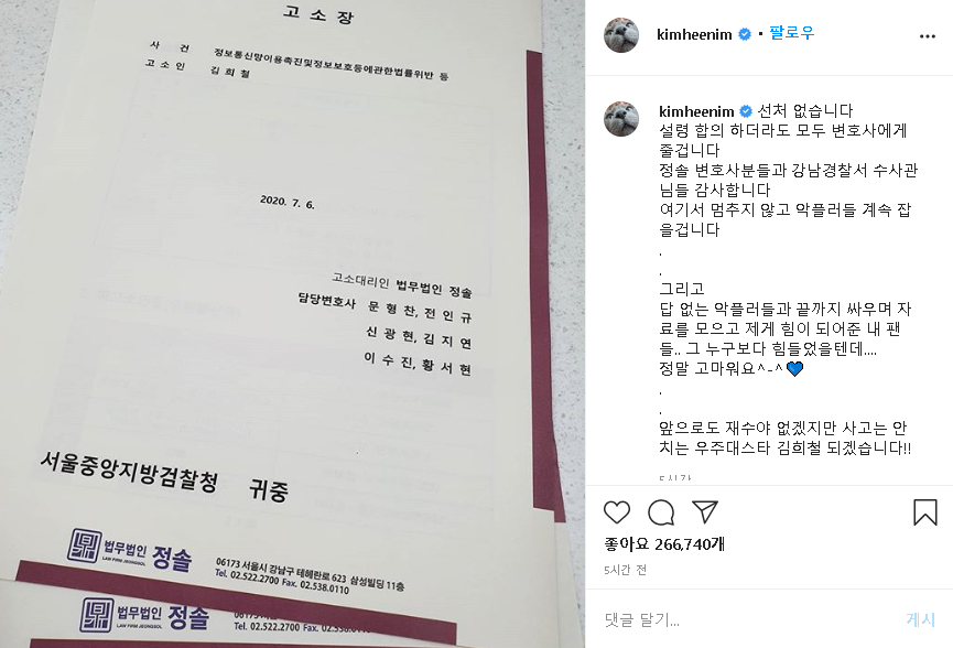 지난 22일 김희철은 인스타그램에 “선처 없습니다. 설령 합의하더라도 모두 변호사에게 줄겁니다. 정솔 변호사분들과 강남경찰서 수사관님들 감사합니다. 여기서 멈추지 않고 악플러들 계속 잡을 겁니다. 그리고 답 없는 악플러들과 끝까지 싸우며 자료를 모으고 제게 힘이 되어준 내 팬들.. 그 누구보다 힘들었을텐데.. 정말 고마워요 ^-^”라고 밝혔다.