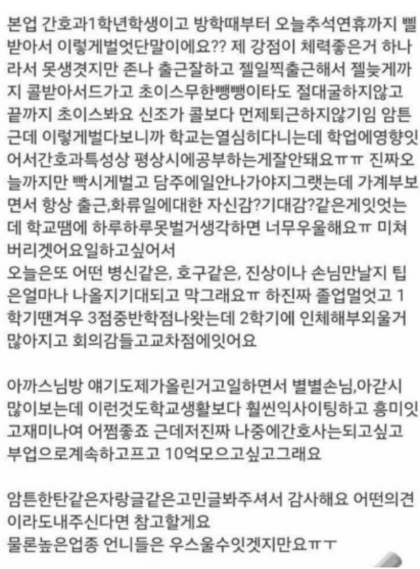 업소에서 일하는 대학생의 충격적인 사연이 화제가 되고있다.
