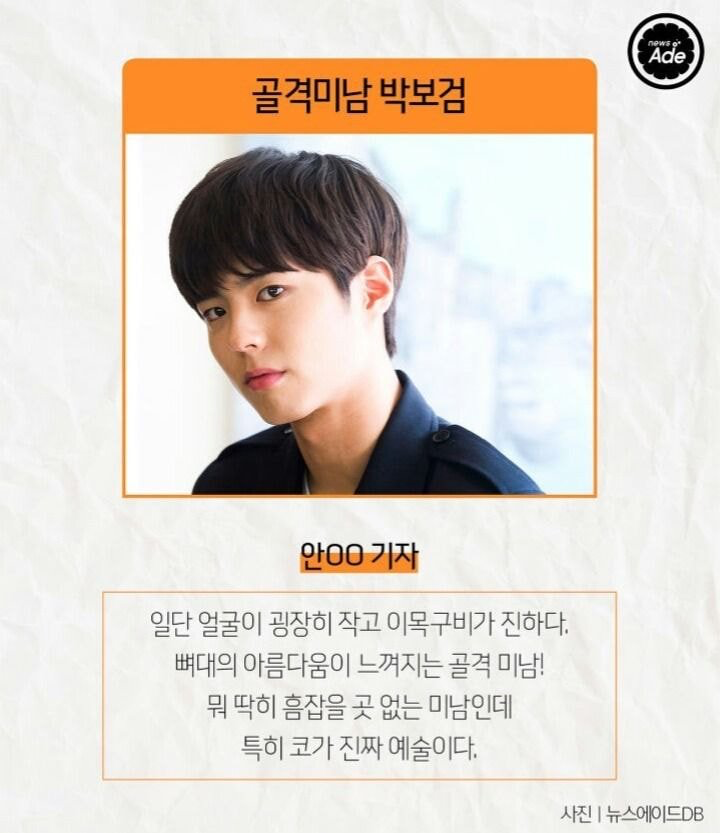 ‘안00’기자는 “골격미남 박보검, 일단 얼굴이 굉장히 작고 이목구비가 진하다. 뼈대의 아름다움이 느껴지는 골격미남!”이라며 “뭐 딱히 흠잡을 곳 없는 미남인데 특히 코가 진짜 예술이다.”라고 말했다.