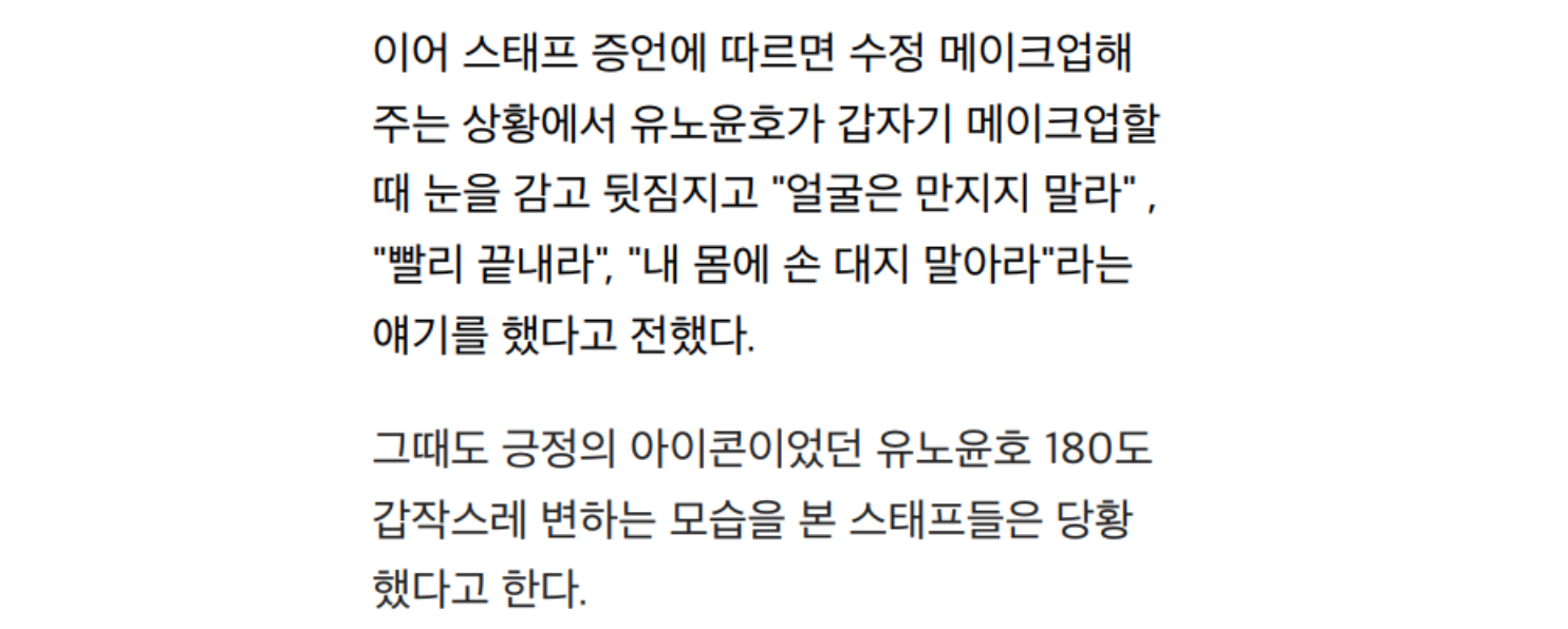 그리고 한 스태프 증언에 따르면 수정 메이크업 해주는 상황에서 유노윤호가 갑자기 메이크업할 때 눈을 감고 뒷짐지고 “얼굴은 만지지 말라”, “빨리 끝내라”, “내 몸에 손 대지 말아라”라는 김정현과 비슷한 반응을 보였다는 얘기를 전하기도 했다.