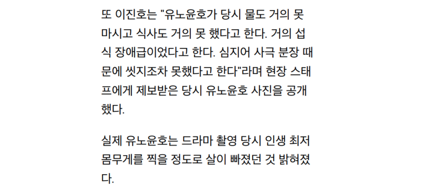 또 한 유튜버의 제보에 따르면 “유노윤호가 당시 물도 거의 못 마시고 식사도 거의 못할 정도였다”며 드라마 촬영 당시 인생 최저 몸무게를 찍을 정도로 살이 빠졌다고 한다.