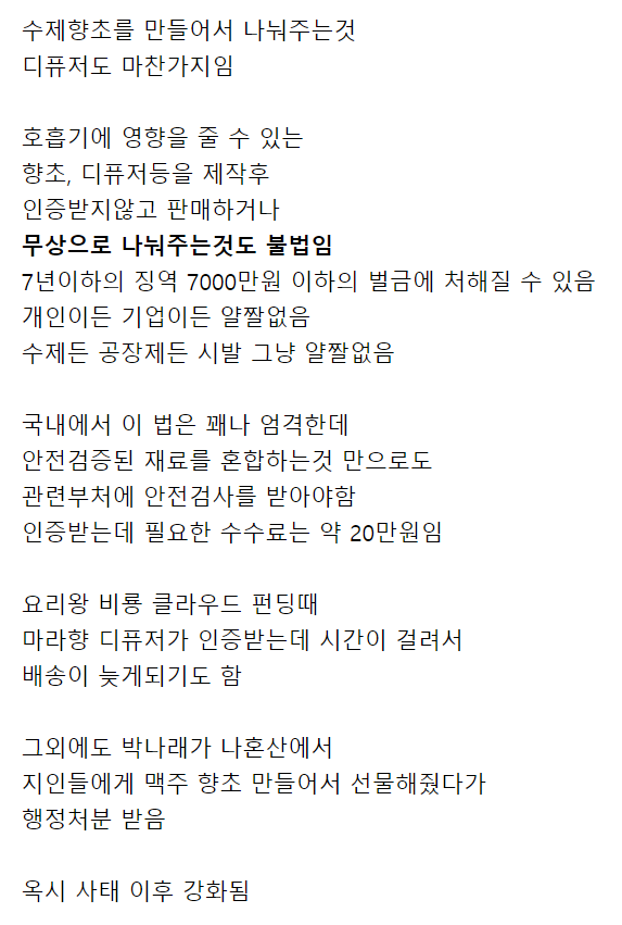 글쓴이는 “수제 향초를 만들어서 나눠주는 것과 디퓨저를 만들어서 나눠주는 것도 우리나라에선 불법입니다.”라며 이야기를 시작했다.