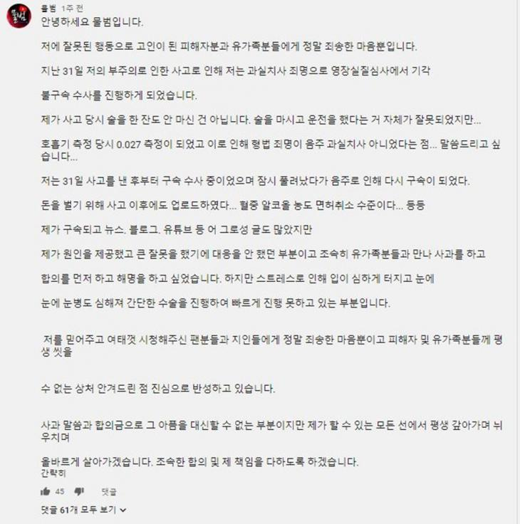 이후 해당 BJ는 사과문에 자신이 술을 먹었지만 음주과실치사가 아니였다는 점에 대해 강조했다.