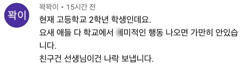 이 소식을 접한 누리꾼들은 ” 와 요즘 애들 쎄다” , “요즘 애들 생각은 이렇구나” ,”선생님들 개 극한 직업”, ” 와 진짜 무섭다..”, “원바 뭐야 ” ,” 딜미터기 오지고 지린다” 등의 다양한 반응을 보이고 있다.
