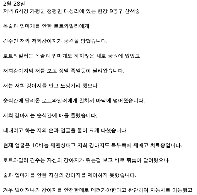 때는 지난 2월 28일 저녁 6시경에 산책을 하다가 목줄과 입마개를 안 한 ‘로트 와일러’라는 맹견에게 견주와 강아지가 공격을 당했다.