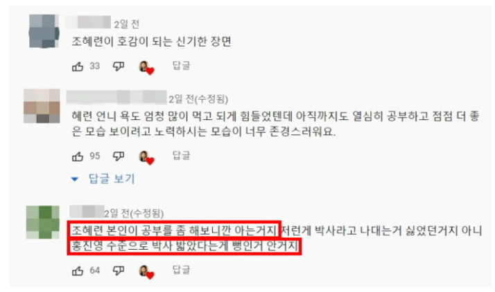 이 내용을 본 네티즌들은 ‘홍진영이 구라치는 거 눈치채고 저러는 듯’, ‘조혜련이 석사일 줄이야’, ‘조혜련이 다르게 보인다’라 다양한 반응을 남겼다.