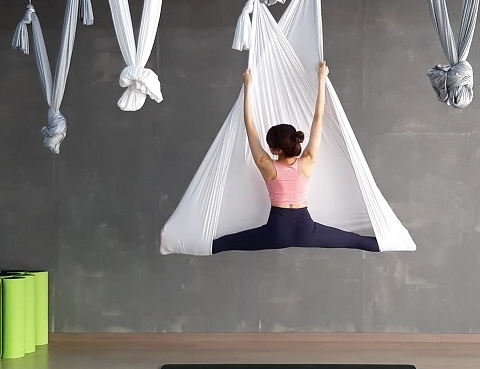 말 그대로 해먹이나 고무끈, 기타 신축성 있는 소재의 구조물을 가지고 하늘에 대롱대롱 매달려서 중력을 이용하여 요가를 하는 것이다.