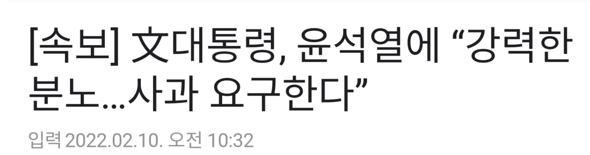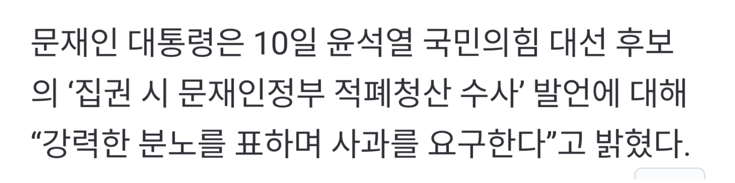 문재인 대통령이 10일 윤석열 대선 후보의 집권 시 문재인정부 적폐청산 수사’ 발언에 대해 “강력한 분노를 표하며 사과를 요구한다”고 밝혀 화제가 됐다.