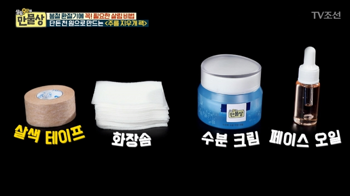 그가 소개한 준비물은 화장솜과 의료용 반창고, 수분 크림, 페이스 오일로 매우 간단하다.