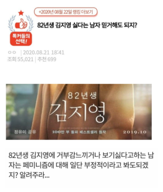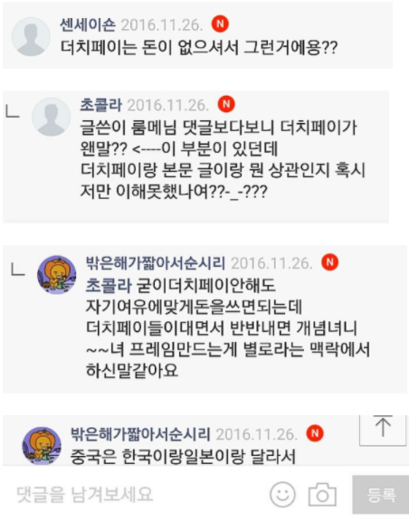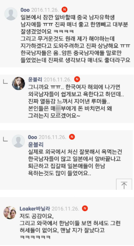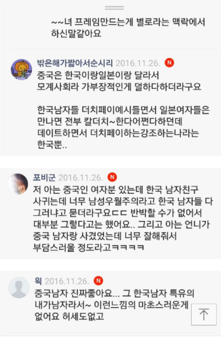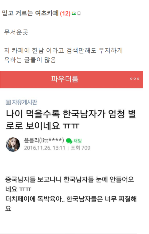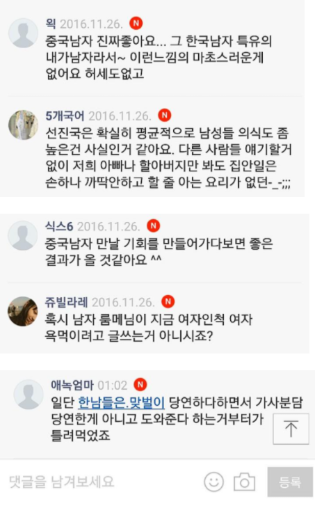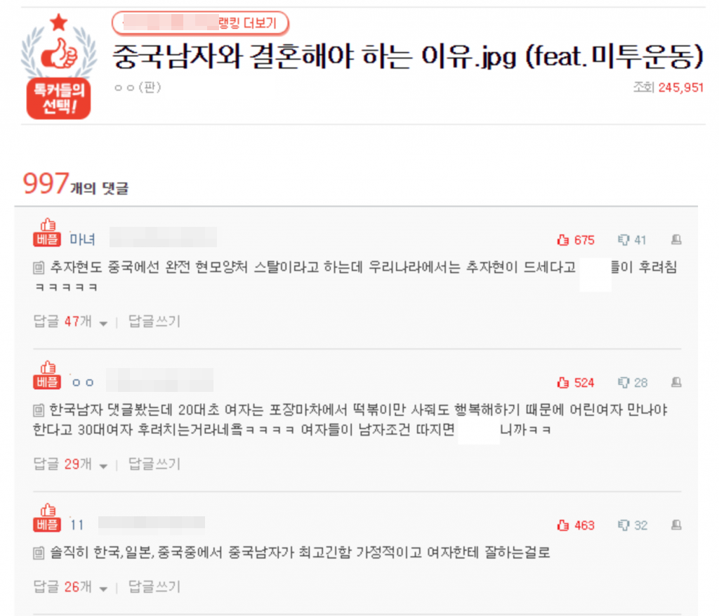 그리고 최근 많은 여성들이 중국 남성들이 좋다는 반응을 보이며 중국이나 일본 남자가 한국남자보다 좋다는 등 많은 글이 올라오고 있다.