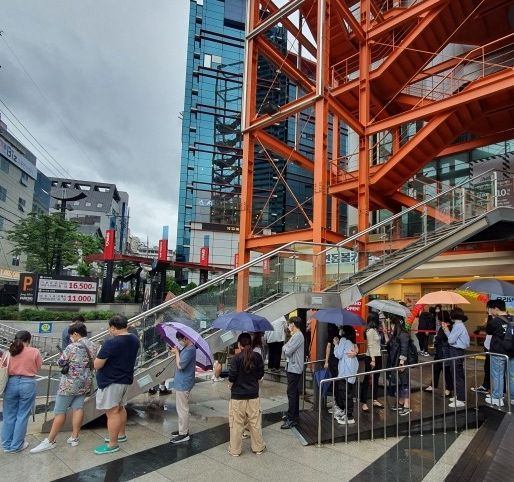 해당 사진에서 고객들은 날씨에 아랑곳하지 않고 볼카츠를 먹기 위해 기꺼이 웨이팅을 감수하며, 하염없이 시간을 기다렸다.