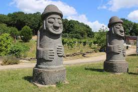 돌하르방은 제주도 특유의 석상이다. 현무암을 깎아서 만들어지는데, 크기는 130cm ~ 190cm정도이다. 돌하르방의 얼굴은 싱긋 웃는 입과 동공이 없이 불룩 튀어나온 눈, 크고 넓적한 코, 미세하게 웃는 모습, 그리고 손은 배 위에 얹어져 있다.