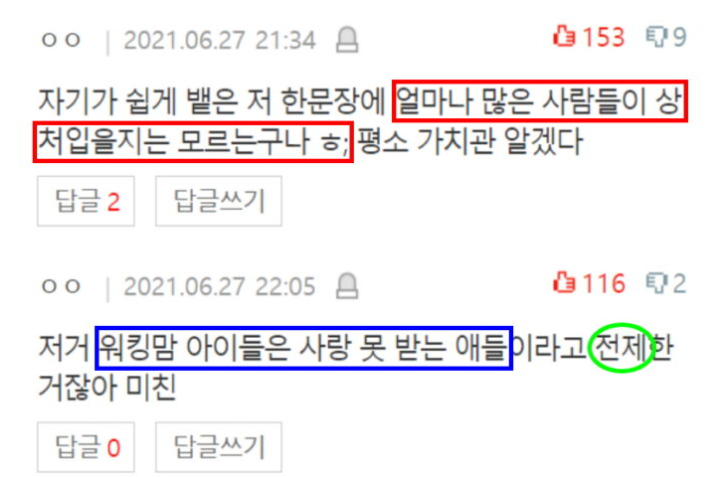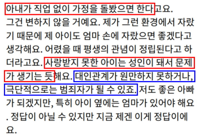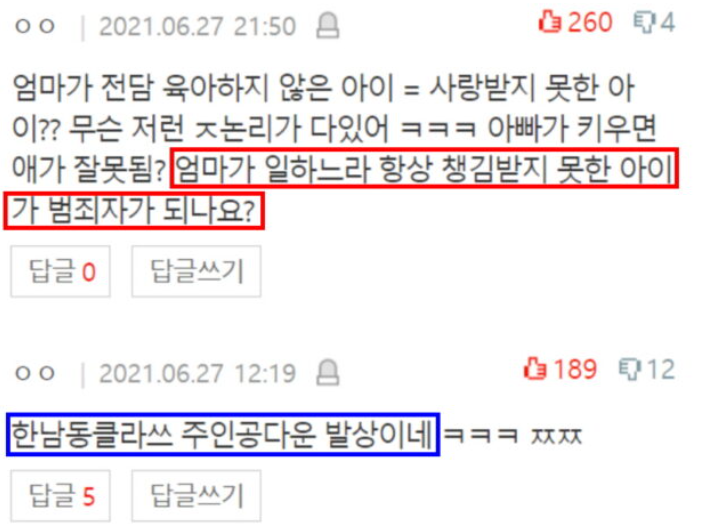 거기서 그치지 않고 그는 “그런 아이는 대인 관계가 원만하지 못하거나 극단적으로 범죄자가 될 수 있다”는 발언에 한부모 가정을 폄하하는 것이 아니냐는 댓글이 분분하게 올라왔다.