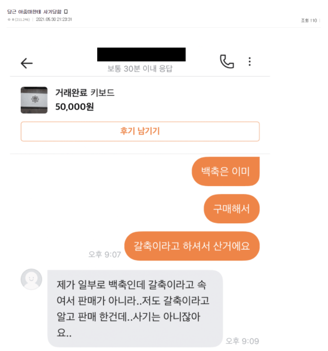 이에 글쓴이는 “갈축인 줄 알고 샀는데 알고 보니 백축이었고, 환불을 원했더니 판매자가 자기가 일부러 속여서 판매한 것이 아니라 사기가 아니라고 주장하고 있습니다.”라며 당시 상황을 전했다.