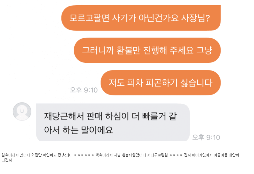 환불을 원한 글쓴이에게 돌아온 답변은 “다시 다른 사람한테 판매하시는 게 더 빠를 거 같아서 하는 말입니다.”었다.