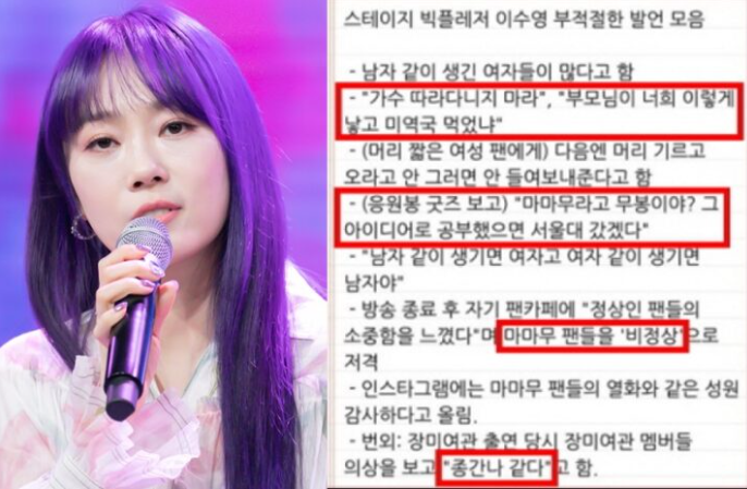 한편, 이수영이 마마무 팬들에게 망언을 한 정황도 드러나 엄청난 화제가 됐다.